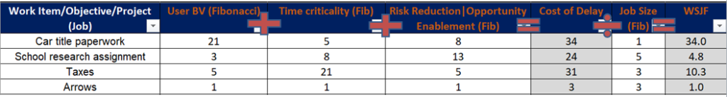 When all of the white columns are filled in, the Cost of Delay and WSJF is calculated. What we want is the WSJF.
